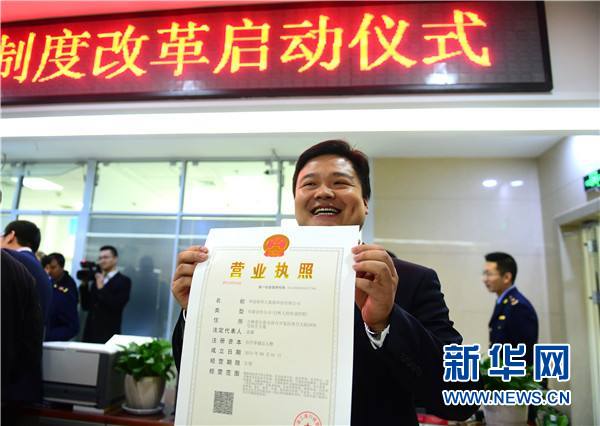 2015年10月8日,华创智库大数据科技有限公司法人代表姜镪领取吉林省首张“五证合一”营业执照。新华社记者 林宏 摄