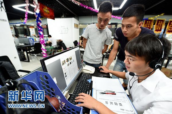 2015年7月19日,在浙江义乌国际商贸城网商服务区,“聚宝网商”的企业员工为新注册电商企业提供产品销售运行服务。2015年上半年,义乌市新增电商企业6869家,同比增长23%;电子商务实现交易额618亿元,同比增长31%。新华社发(龚献明 摄)