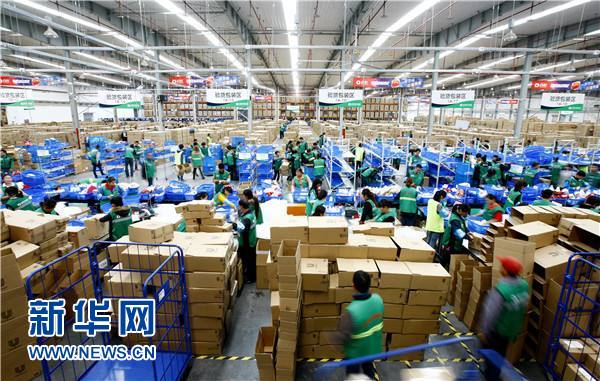 2015年11月11日,百世汇通上海一号仓储运分拣中心全景。当日凌晨,一年一度的“双十一”网络购物节正式拉开序幕。新华社记者 方喆 摄