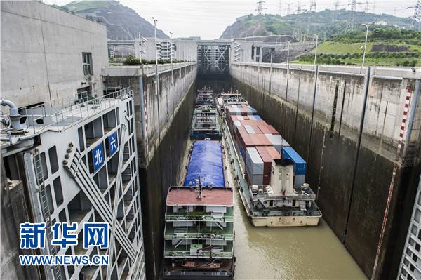 2015年6月22日,船舶通过三峡双线五级船闸上行。当年5月,三峡船闸和葛洲坝船闸通过货运量双双破千万吨。新华社发(郑家裕 摄)