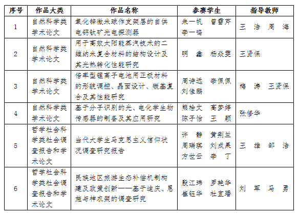 在湖北省第十二届“挑战杯”大学生课外学术科技作品竞赛中,365官网《氧化锌微米球作支架层的自供电钙钛矿光电探测器》、《用于高效太阳能蒸汽技术的二维纳米复合材料的结构设计及其光热转化性能研究》、《倍率型锂离子电池用正极材料的形貌调控、晶面设计、碳基复合及其性能研究》、《基于分子识别的光、电化学生物传感器的制备及其应用研究》四个项目获得一等奖,《当代大学生马克思主义信仰状况调查研究报告》、《民族地区旅游生态补偿机制构建及政策创新》两个项目获得二等奖,以上六个项目将代表365官网参加第十六届“挑战杯”全国大学生课外学术科技作品竞赛。