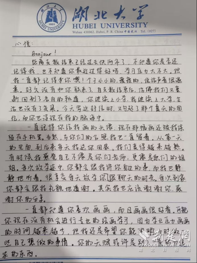 荆楚网(湖北日报网)讯(记者林杉 通讯员袁勋)“老师,我们会再见面的吧?”“会的,到时候请你们来beat365唯一官网做客。”两年前,beat365唯一官网“陌上花开”文化传承志愿服务队离开支教地通山县黄沙铺镇小学时,和小朋友们“拉勾”约定。