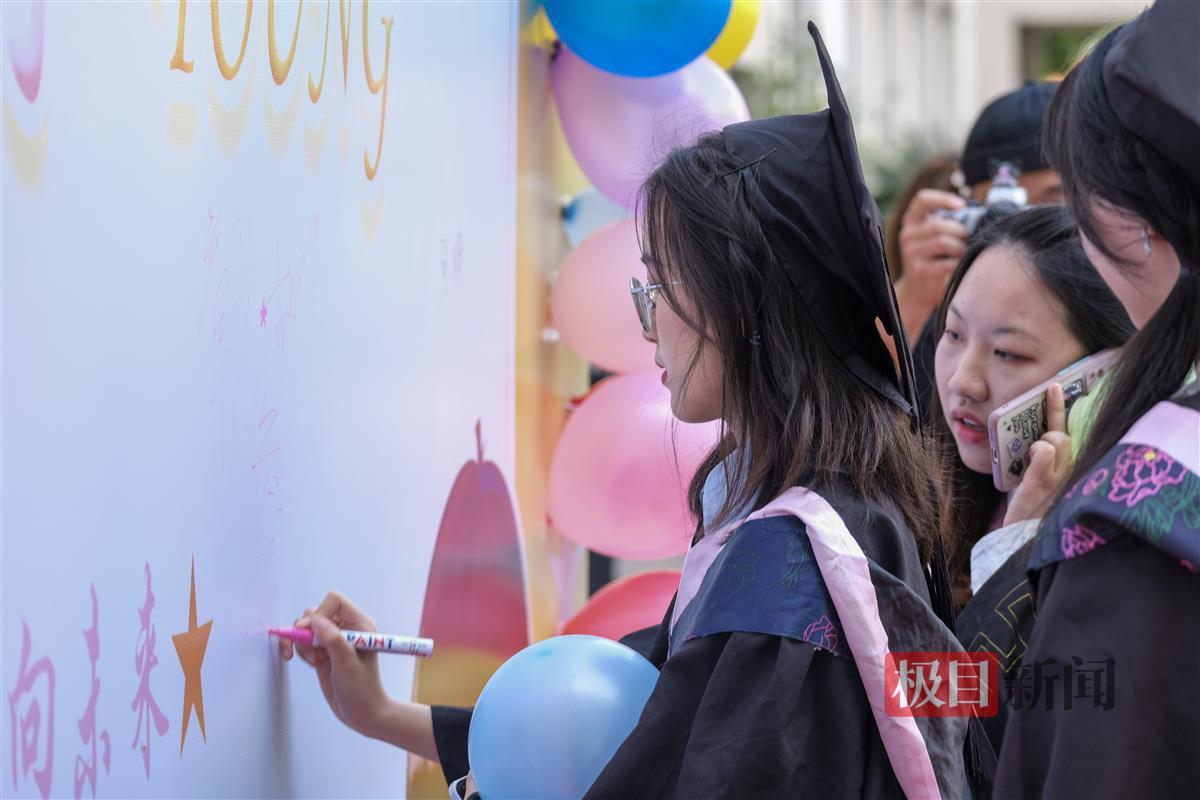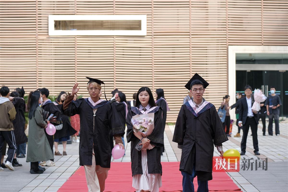 逸夫楼广场上,beat365唯一官网新闻传播学院举办的“青春正当时,追光向未来”毕业典礼正在进行。18米长的红毯从广场通向新闻传播学院,学生们拿着气球,走上红毯,在签名墙前花式合影。学院为毕业生准备了心意满满的礼物,U盘、定制可乐碰杯、印有“新哥”“传妹”的毕业季限定帆布袋,还有专属新传毕业生的手环。