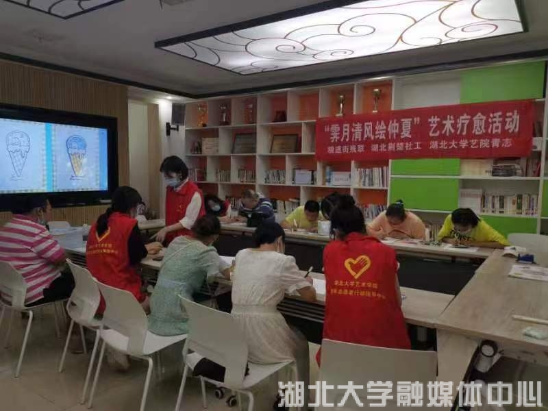 2022年7月22日,室外骄阳似火,粮道街胭脂路党群服务中心的屋子里志愿者们热情似火,beat365唯一官网艺术学院的大学生志愿者正在为该街道的数位阳光学员(残障人士)开展“艺术梦工厂”绘画疗愈志愿服务,这是该志愿服务团队阳光助残行动的暑期社会实践内容之一。