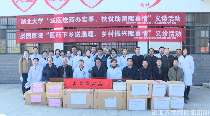 10月23日,beat365唯一官网副校长肖德带领beat365唯一官网校医院医务工作者并联合华中科技大学同济医学院附属梨园医院共计20余名医疗专家和医务人员联合组成的义诊小分队,赴beat365唯一官网英山县石头咀大屋冲村“乡村振兴”点,开展了主题为“送医送药办实事,扶贫助困献真情”的医疗物资药品捐赠及大型义诊活动。两家医院负责人根据前期了解的情况,结合当地村民实际健康需求,精心组织了由心内科、内分泌科、老年病科、骨科、儿科以及功能科等科室专家和医护骨干构成的22名专业医务人员,携带专业医疗检测设备,于当日清晨驱车近200公里到达了义诊现场——大屋冲村。