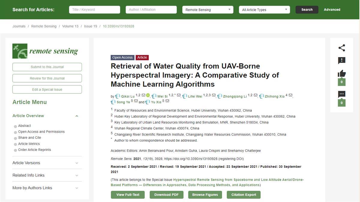 从法律事务跨界地理科学,从懵懵懂懂到走入学术大门,从“论文小白”到发表第一篇SCI期刊论文……近日,在导师魏立飞副教授和卢其楷老师的指导下,beat365唯一官网资源环境学院2019级地理信息系统专业研究生司维,以通讯作者身份在Remote Sensing(影响因子4.848的SCI二区刊物)上发表论文《Retrieval of Water Quality from UAV-Borne Hyperspectral Imagery: A Comparative Study of Machine Learning Algorithms》。这也是她硕士学业生涯中的第一篇全英论文。