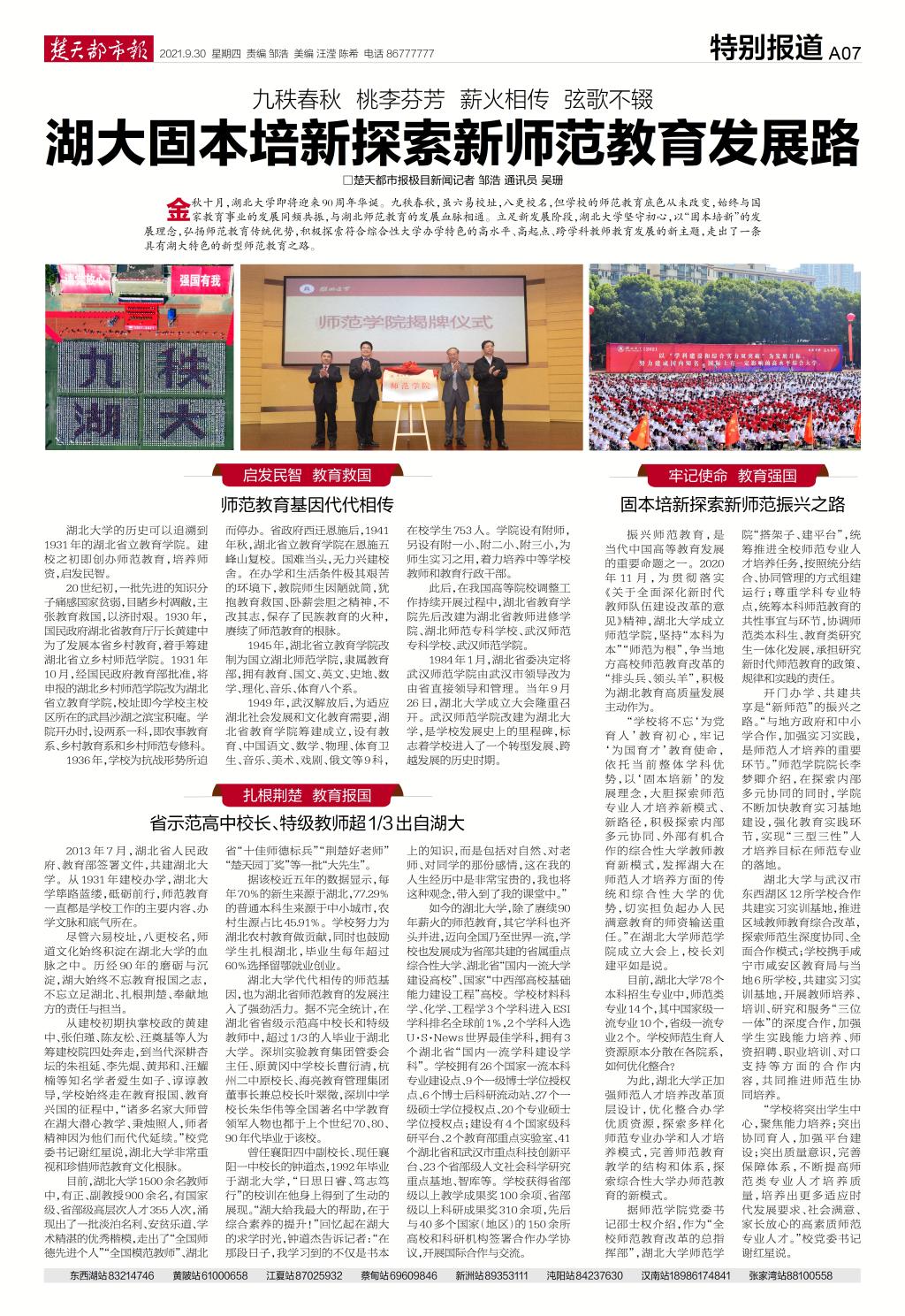 金秋十月,beat365唯一官网即将迎来90周年华诞。九秩春秋,虽六易校址,八更校名,但学校的师范教育底色从未改变,始终与国家教育事业的发展同频共振,与湖北师范教育的发展血脉相通。立足新发展阶段,beat365唯一官网坚守初心,以“固本培新”的发展理念,弘扬师范教育传统优势,积极探索符合综合性大学办学特色的高水平、高起点、跨学科教师教育发展的新主题,走出了一条具有湖大特色的新型师范教育之路。