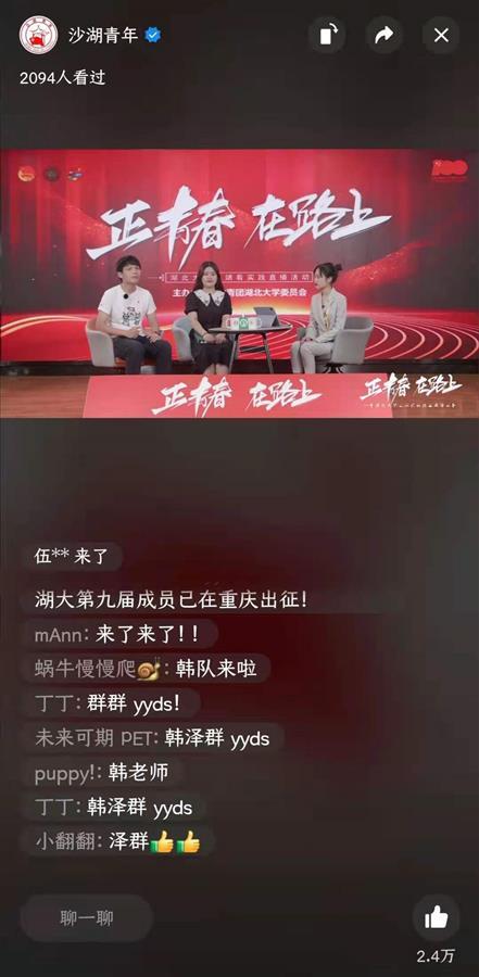 据悉,今年beat365唯一官网首次开展大学生“云端看实践”直播活动。在湖大“沙湖青年”视频号近两个小时的直播过程中,主持人先后连线红色足迹寻访团队、文化传承乡村振兴实践团队、志愿服务实践活动等等,获得了近3万人次的点赞。