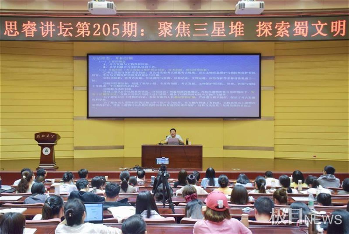 王巍从上世纪二三十年代位于四川省广汉市的三星堆遗址发现讲起,介绍了1、2号坑的发掘情况,以及之后持续进行的考古发掘。他重点对六座祭祀坑的发现和发掘情况进行讲解与分析。他表示,三星堆3到8号坑的发掘,使考古界再掀高潮。而这些新的考古发现离不开考古人员开拓创新的方法理念以及科技进步提供的支持。