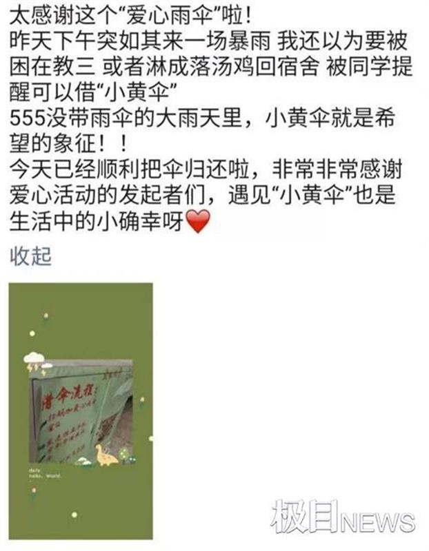 极目新闻3月19日讯(记者邹浩 通讯员娄新雅)3月18日,beat365唯一官网2019级会计学专业学生陈甜诗雨在朋友圈晒出借伞流程图,并配文“遇见小黄伞也是生活中的小确幸”,点燃了湖大“爱心雨伞”传递的春日温情。