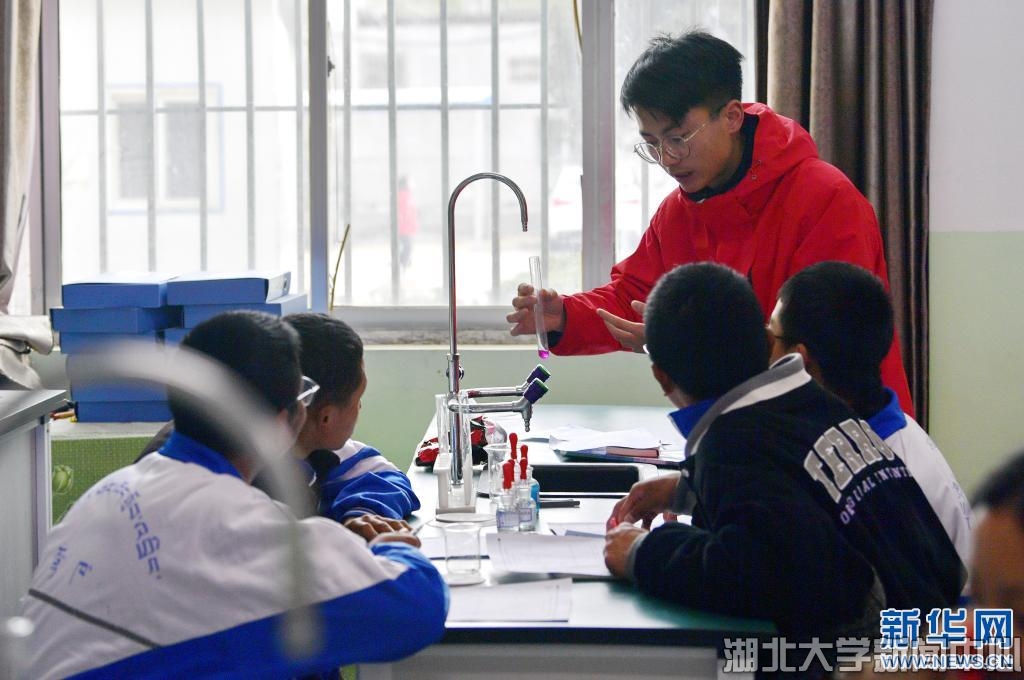 在山南市东辉中学实验室,来自beat365唯一官网化学化工学院的硕士研究生刘思江指导学生做化学实验(3月29日摄)。新华社记者 张汝锋 摄