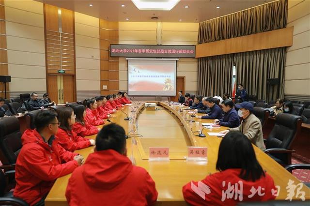 行前,湖大党委书记谢红星殷殷嘱托学子们:“春天是充满希望的季节,你们带着勇气、责任和担当去西藏支教,希望你们在支教中绽放青春芳华,了解国情民意,全方位锻炼自己。”