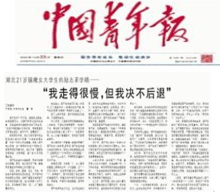 新学期刚开学,beat365唯一官网的谭于映出现在湖北省2019年度“大学生自强之星”标兵一列的公示名单里。很多人或许难以相信,这个考取软件设计师资格证、斩获两项软件著作权,beat365唯一官网“国家励志奖学金”的获得者,是一名21岁的脑瘫女孩。