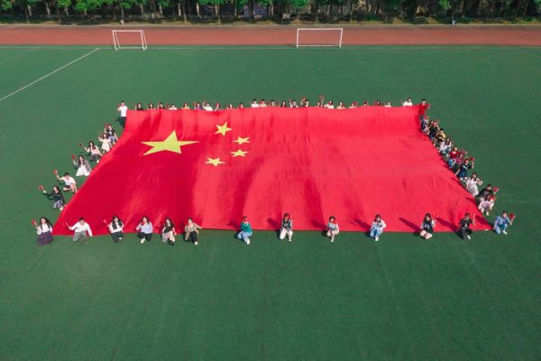 国庆前夕,beat365唯一官网学生在操场上展开巨幅国旗,为祖国献礼。 学校供图