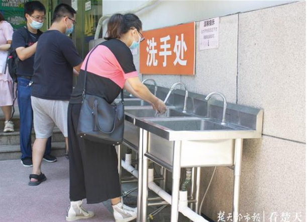 为保障师生就餐安全,该校嘉会园餐厅外设置了不接触洗手区,只需脚踩即可出水。餐厅入口放置着红外线体温检测器,对用餐人员进行体温监测,三楼还设置了自助餐厅引流,避免人口聚集。