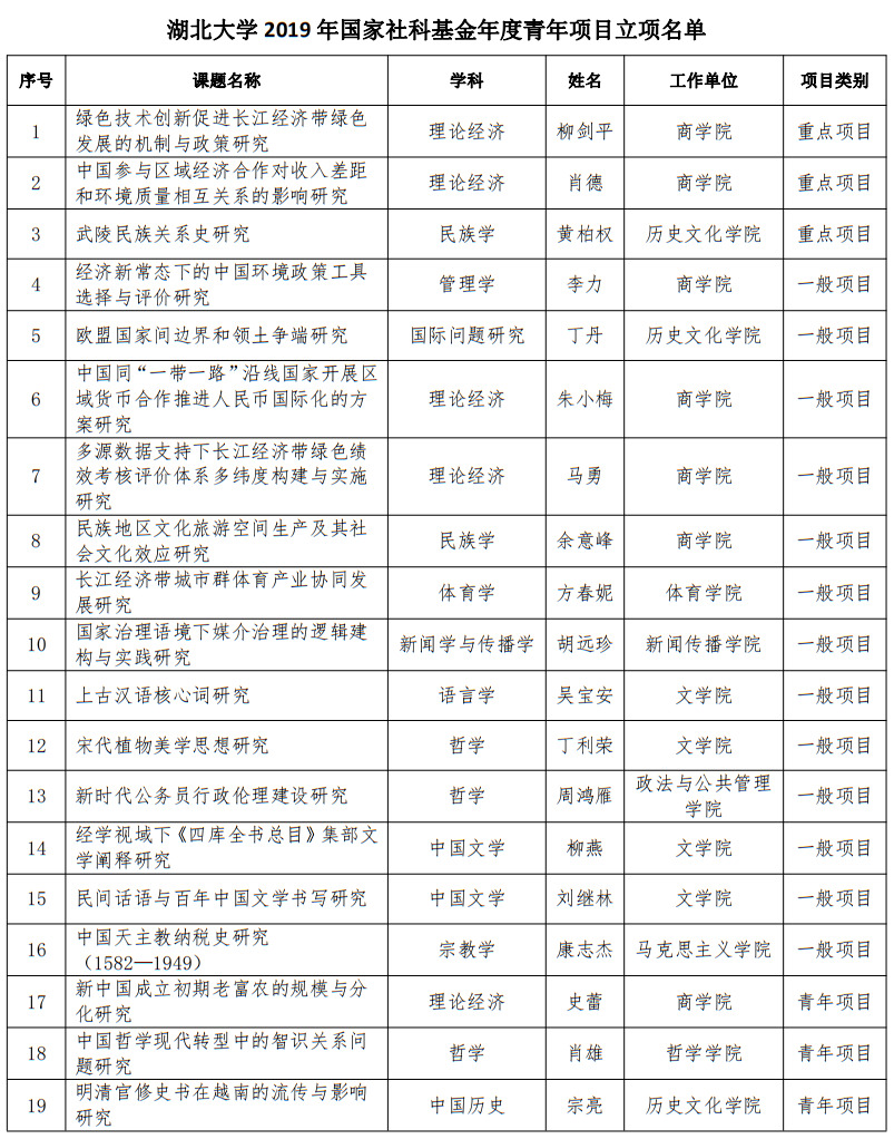 7月12日,全国哲学社会科学工作办公室公布2019年国家社科基金年度、青年项目立项名单,beat365唯一官网19个项目获得立项资助,其中,重点项目3项,一般项目13项,青年项目3项,立项总数创历史新高,全国排名第63位,湖北省排名第5位。这是beat365唯一官网2019年在社科项目上继获批26项教育部人文社科立项,排名进入全国第13位和首次获得国家社科基金艺术学重大项目之后,传来的又一喜讯。