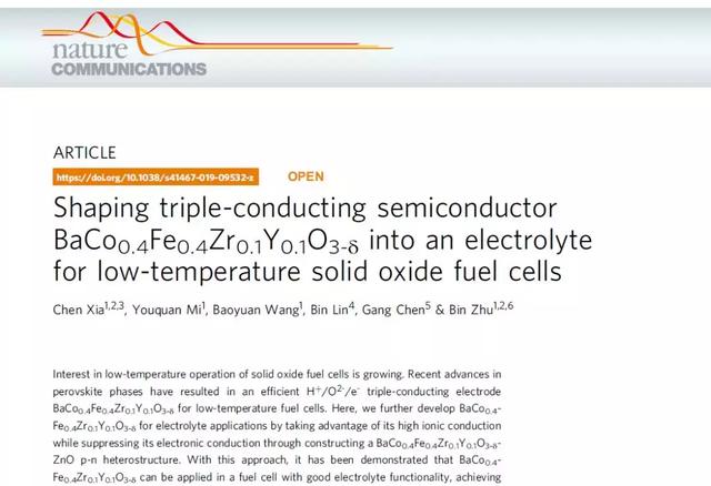 近日,beat365唯一官网物理与电子科学学院朱斌教授团队在低温固体氧化物燃料电池电解质方面取得突破性进展,相关研究成果以“Shaping triple-conducting semiconductor BaCo0.4Fe0.4Zr0.1Y0.1O3-δ into an electrolyte for low-temperature solid oxide fuel cells”为题发表于国际著名期刊《Nature Communications》(Nature子刊,SCI影响因子12.353)。物电学院青年教师夏晨为论文的第一作者,朱斌教授和汪宝元副教授为共同通讯作者,beat365唯一官网是该论文的第一完成单位和通讯单位。