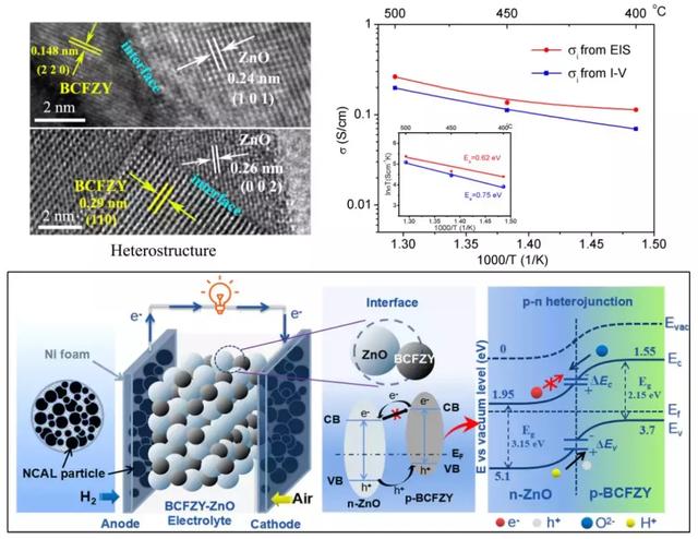 为了充分利用BCFZY在低温下的优势并消除其电子电导的负面影响,朱斌教授团队提出了pn异质结构电解质的想法,即通过引入n型半导体ZnO与p型半导体BCFZY构建异质结构复合电解质,利用体异质结促进离子的运输并且阻挡电子的导通,从而实现电解质功能。研究发现,所制备的BCFZY-ZnO电解质具有大量的异相界面,应用于低温SOFC后能够实现理想的开路电压和输出功率,排除了电子的短路问题。通过对交流阻抗谱和极化曲线的分析,研究发现该材料具有优异的混合质子/氧离子电导率(500 ℃达到0.20 S/cm)。基于对两种半导体在SOFC气氛下导电类型以及能级位置的测试,研究团队从能带理论的角度分析了电解质中体异质结内建电势对离子运输的促进机制以及对电子的阻挡作用。这一研究成功地将离子导电型半导体整合到SOFC的电解质层中,为发展高性能的低温电解质提供了一个全新的思路。该项工作依托于物电学院“铁电压电材料与器件”湖北省重点实验室,得到国家自然科学基金的资助。
