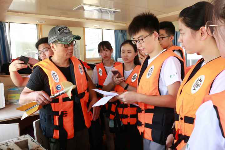 听完陈局长的情况介绍后,同学们与陈局长进行了深入交流,并登上水质监测船实地感受长江水文监测情况。在水文站监测船上,老船长热情地向同学们演示了浮式水位计、水流测速仪和测沙仪的使用过程,介绍了多年来他们观测到的长江水文变化情况。一位老员工还展示了去年11月拍到的江豚跃出水面的视频,“这说明,洞庭湖水生态环境在变好。”