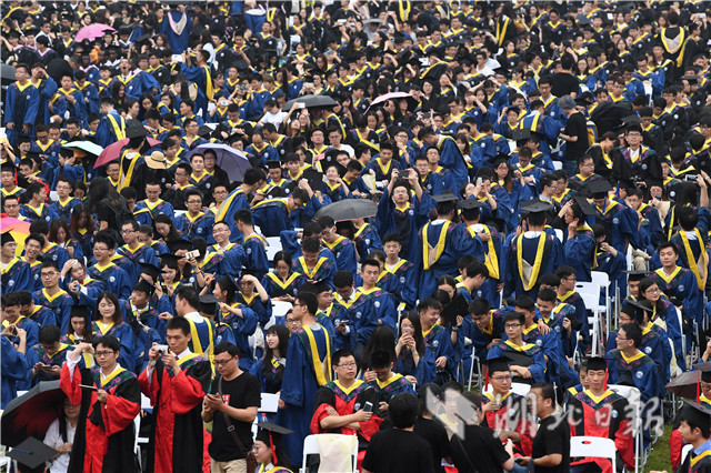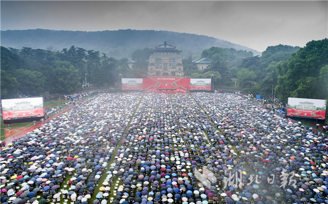 6月22日,武汉大学毕业典礼现场。当天,武汉大学2018年毕业典礼在雨中如期举行,1万余名武大毕业生身着学位服坐满整个操场,81位豪华导师团成员为毕业生一一拨穗授学位,为毕业生们送上美好祝福,学校还为每位在场毕业生拍摄一张与拨穗导师的珍贵合影。据悉,武汉大学今年共有15239名学生毕业,其中,本科生7279人、硕士研究生6826人、博士研究生1134人。