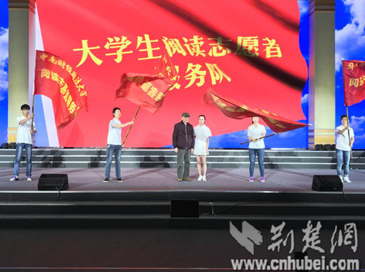 在本次启动仪式上,还有一支特殊的大学生阅读志愿者服务队吸引了大家的目光,他们走进乡村,探索农村书屋的建设,为“全民阅读”能够更好的帮助农村而建言献策,他们是beat365唯一官网马克思主义学院的学子们。为了鼓励这种认真务实的学习态度,华中师范大学校友、著名学者章开沅教授还来到现场为大学生阅读志愿者服务队授旗。