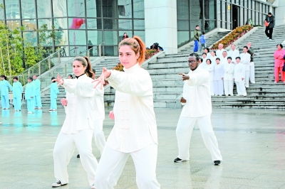来自巴西的陆思妤是领操,比赛还没有开始,她就在人群中一遍遍小幅度地温习动作。音乐响起,7名分别来自苏丹、阿根廷、巴西等国家的留学生身着太极服,表情恬淡自然,呼吸吐纳、出拳勾腿,动作整齐划一。比赛裁判员付福娥评价:“虽然他们的动作有些不是很规范,但他们的神情、态度和动作都非常认真,有板有眼的,非常不错。”