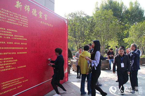 与会代表在留言墙上签名承诺恪守底线,追求高尚新师德。