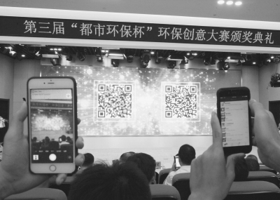 17日,第三届“都市环保杯”环保创意大赛颁奖现场,获奖大学生用手机扫描二维码,共同启动第四届“都市环保杯”环保创意大赛 记者刘斌 摄