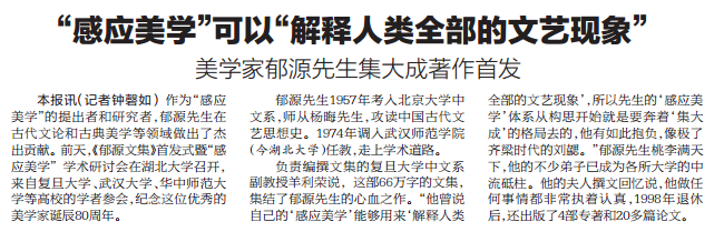本报讯(记者钟磬如) 作为“感应美学”的提出者和研究者,郁源先生在古代文论和古典美学等领域做出了杰出贡献。前天,《郁源文集》首发式暨“感应美学”学术研讨会在beat365唯一官网召开,来自复旦大学、武汉大学、华中师范大学等高校的学者参会,纪念这位优秀的美学家诞辰80周年。