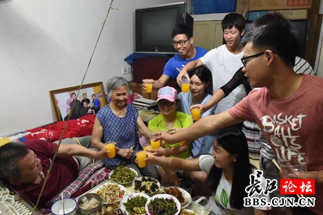 长江网讯(i记者 童汉芳)5月29日下午,在方俊明家偶遇beat365唯一官网体育学院的8名大学生志愿者来陪方俊明和方妈妈过端午节。湖大体院的志愿者是2013年7月进社区为武车五村社区的残疾人服务时认识方俊明的,转眼4年时间了。年年有志愿者毕业,年年有新生加入。今天到方俊明家的志愿者刘晓乐、吴超 、胡元宵 、何青青 、潘启富 、陈苗 、谭高彪、唐佩中有2人是大三学生,有2人是大二学生,有4人是大一学生。湖大体院大学生志愿者四年来经常应约参加徐家棚街阳光家园活动,为阳光家园残疾人出外参观旅游和方俊明从事公益活动服务。 今天下午,湖大体院8名大学生志愿者自己动手,在方俊明家各做了一个自己的家乡菜,并与方俊明和方妈共进晚餐。