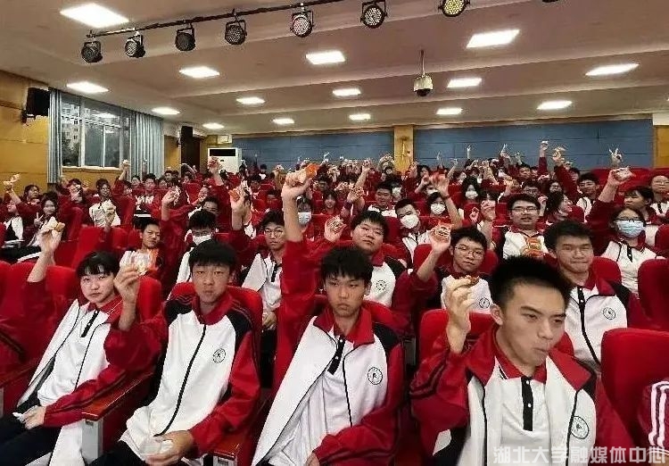 图为beat365唯一官网附属中学的同学们与东辉师生共品中秋月饼。