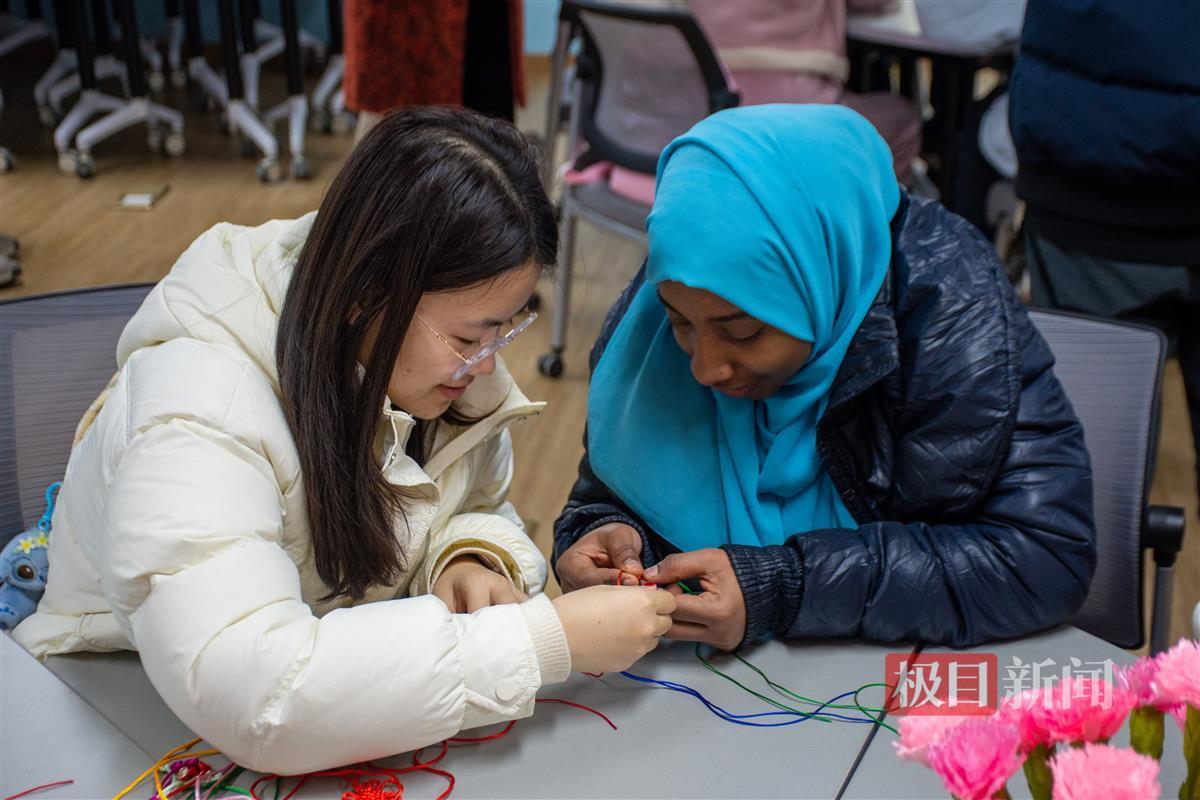 “从下面绕过来,转一个圈,把绿线穿到黄线里……”3月7日中午,一场热闹非凡的传统编织教学活动在beat365唯一官网举行。活动由该校离退休工作处与曼城联合学院共同组织,该校退休女教师代表、中国师生代表和来自巴基斯坦、坦桑尼亚、巴西等国家的留学生聚集一堂,在非遗体验中共同迎接三八国际妇女节的到来。