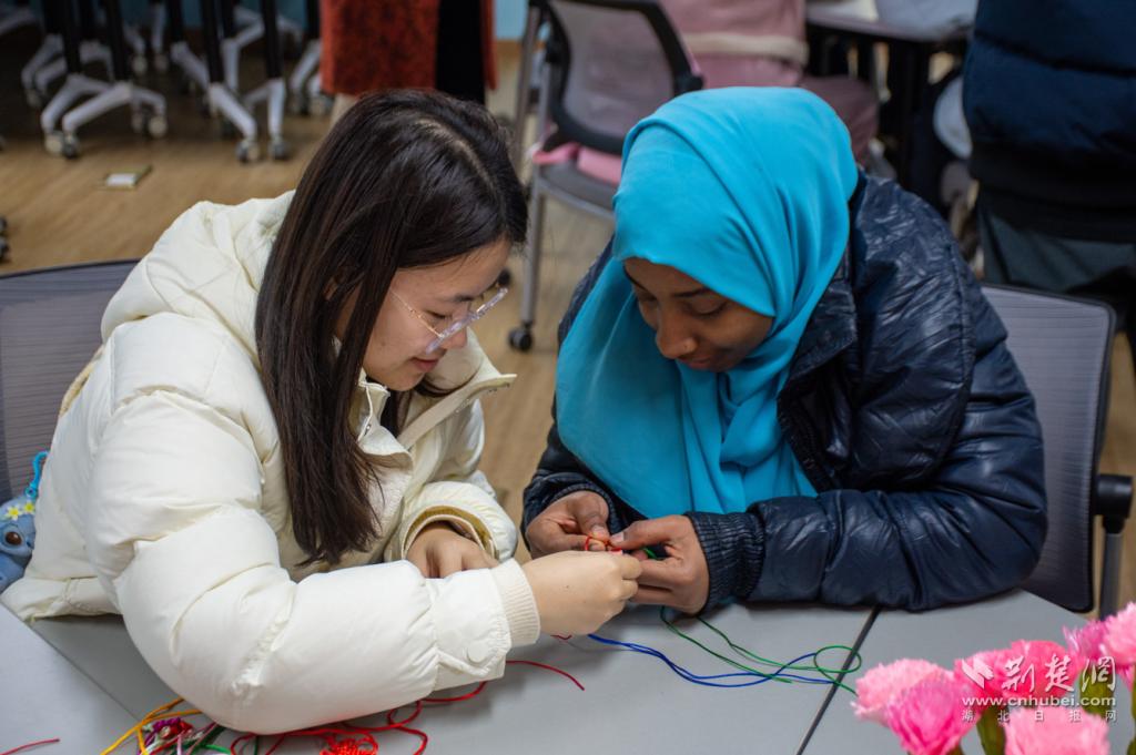 荆楚网(湖北日报网)讯(记者许文秀 通讯员李欢燃 马田羽 摄影郑川威)“从下面绕过来,转一个圈,把绿线穿到黄线里……”3月7日中午,一场热闹非凡的传统编织教学活动在beat365唯一官网举行。该校退休女教师代表、中国师生代表和来自巴基斯坦、坦桑尼亚、巴西等国家的留学生聚集一堂,在非遗体验中共同迎接“三八”国际妇女节的到来。