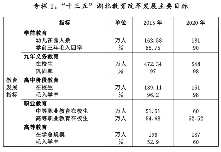 为加快推进湖北教育现代化,根据《国家教育事业发展第十三个五年规划》《湖北省国民经济和社会发展第十三个五年规划纲要》和《湖北省中长期教育改革和发展规划纲要(2011—2020年)》精神,制定本规划。